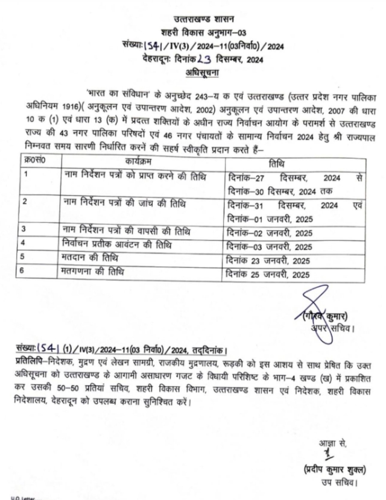 उत्तराखंडमुख्य समाचारप्रदेश के नगर निगमों नगर पालिका नगर पंचायत के सामान्य निर्वाचन 2024 की अधिसूचना। राष्ट्र वर्णनDecember 23, 202401 min Post navigation Previous: मुख्यमंत्री ने बताया कि राज्य में सभी के सहयोग से अब तक 23800 टीबी मरीजों को निक्षय मित्रों द्वारा गोद लिया गया है।Next: मुख्यमंत्री श्री पुष्कर सिंह धामी ने आज नई दिल्ली में केंद्रीय गृह एवं सहकारिता मंत्री श्री अमित शाह से भेंट करी Leave a Reply Cancel replyYour email address will not be published. Required fields are marked *Comment * Name * Email * Website Save my name, email, and website in this browser for the next time I comment.